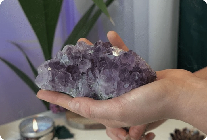 Hold the Amethyst Cluster in your dominant hand while placing your other hand over your heart. Close your eyes and breathe deeply for 3-5 minutes, focusing on letting go.