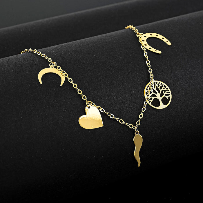 Each charm — from the classic horseshoe to the four-leaf clover — carries a story of hope and positivity. Together, they create a delicate yet powerful symbol of protection and prosperity, wrapped in the radiant glow of genuine gold.