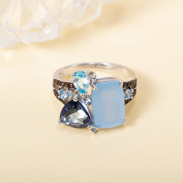 At the heart of this captivating ring is the Chalcedony gemstone, reminiscent of crystalline waters glistening under the sun.