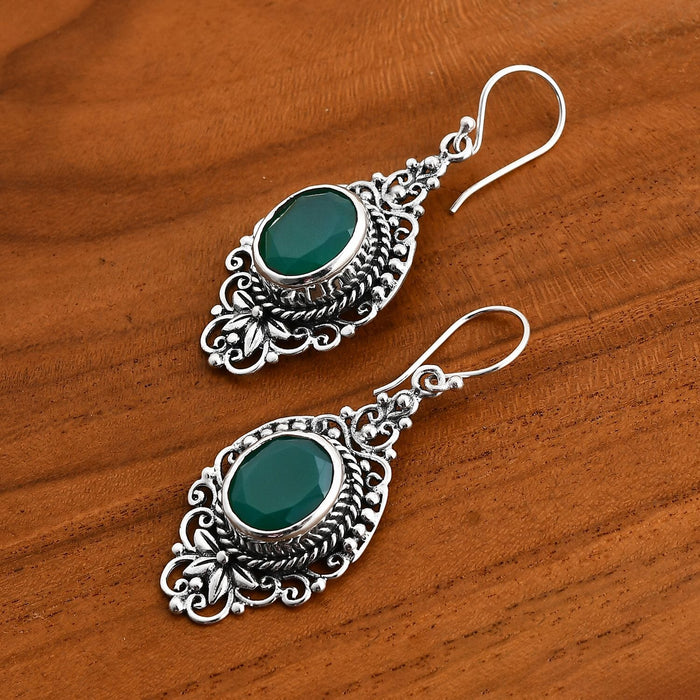 Infuse your style with the healing properties of Verde Onyx with the Bali Legacy Verde Onyx Antique Garden & Floral Earrings. These 8.00 ctw earrings are crafted in high-quality sterling silver, featuring the rich green hues of Verde Onyx, known for its protective, grounding, and healing energies. The floral and antique garden-inspired design adds timeless elegance, while the Verde Onyx gemstones work to foster emotional stability, strength, and renewal.