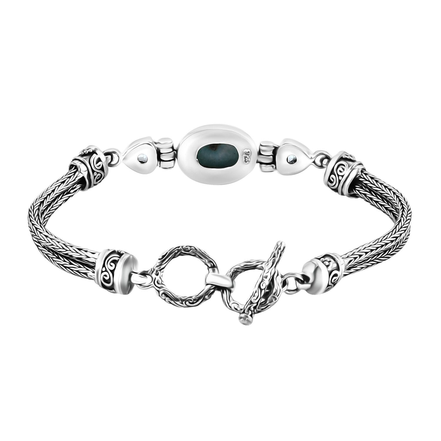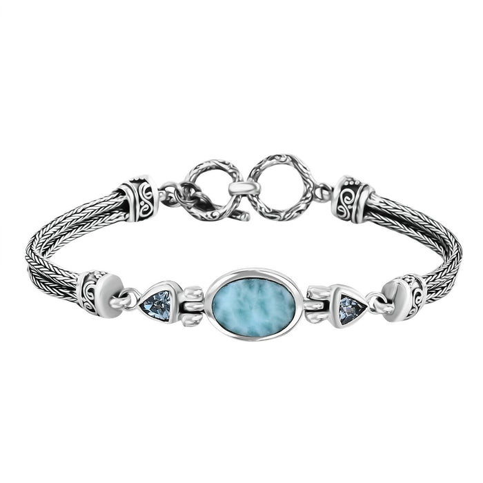 This piece of jewelry is more than just an accessory. The Bali Legacy Green Larimar & Sky Blue Topaz Bracelet blends the tranquil beauty of nature with the rich symbolism of cultural heritage.