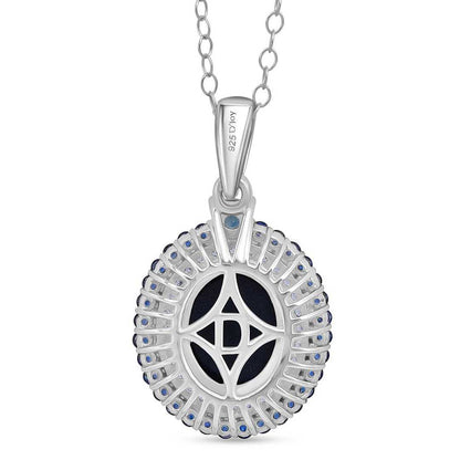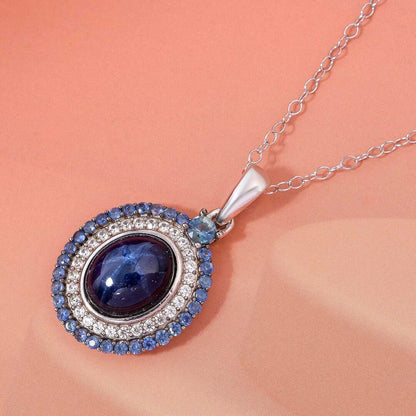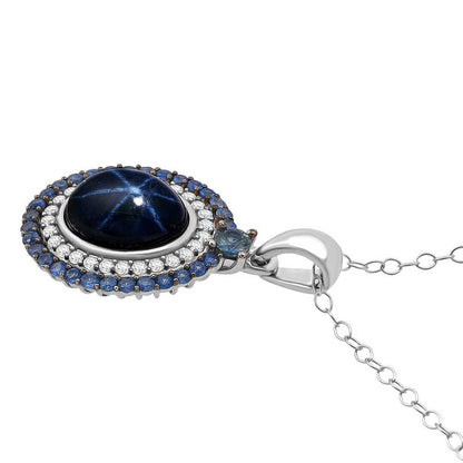 The star sapphire at the heart of this pendant radiates with celestial beauty, enhanced by a starburst design of sparkling accents. It represents hope, inner strength, and inspiration.