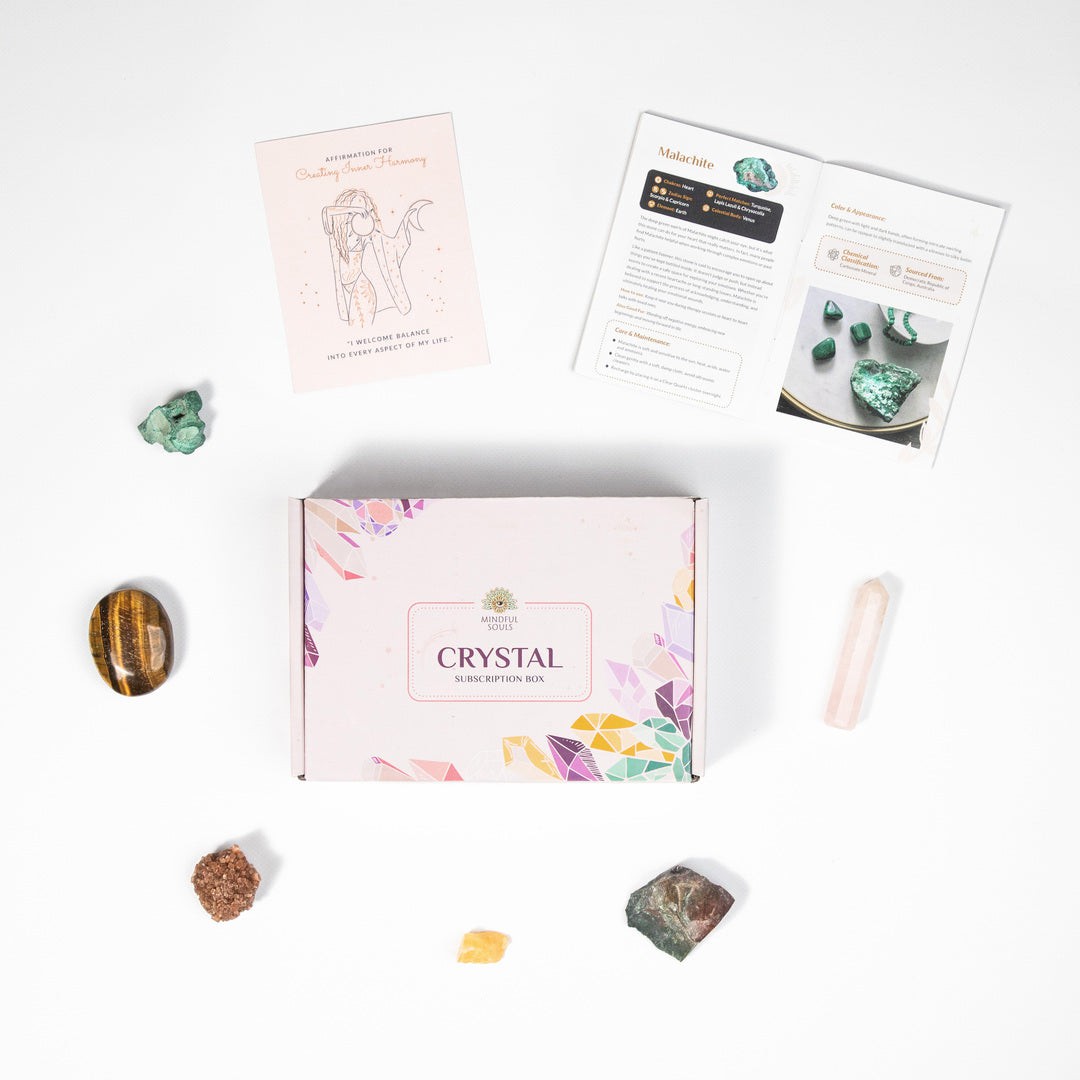 The Crystal Box is a monthly subscription that delivers a curated collection of crystals and rituals, offering a well-rounded journey for personal growth and gemstone collecting. Every box is centered around a specific theme, guiding you through different stages of self-growth and crystal healing.