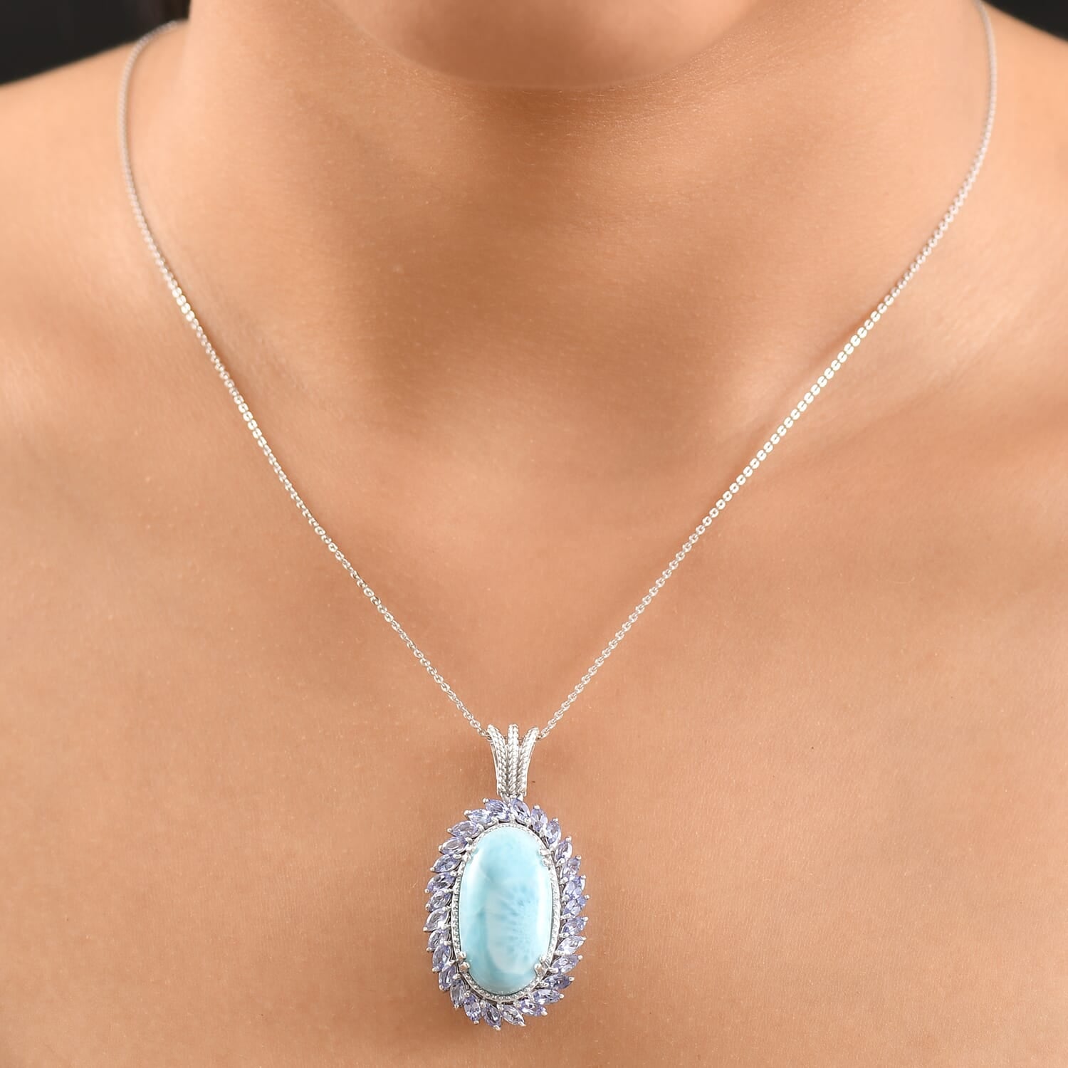 Experience the calming allure of the ocean with the DJOY Larimar & Tanzanite Ocean Waves Pendant Necklace. Featuring 17.80 ctw of stunning Larimar and Tanzanite, this pendant is set in rhodium over sterling silver, creating a piece of elegance that evokes the serenity and power of the sea. Available in oval, pear, or cushion shapes, this necklace offers versatility and a soothing design that’s both peaceful and captivating.