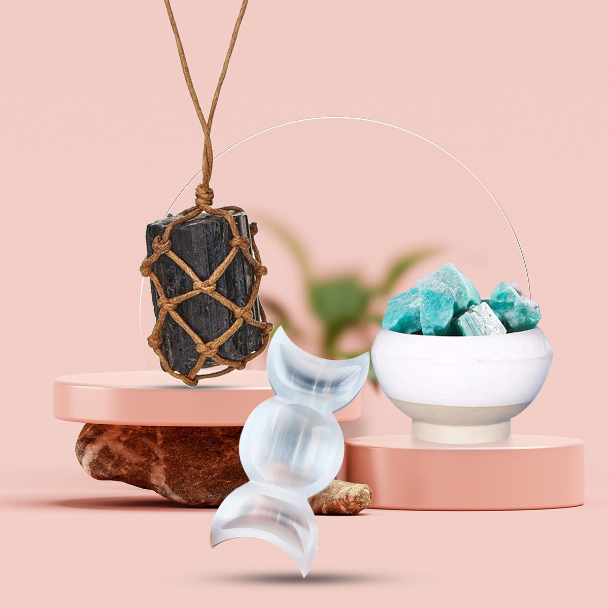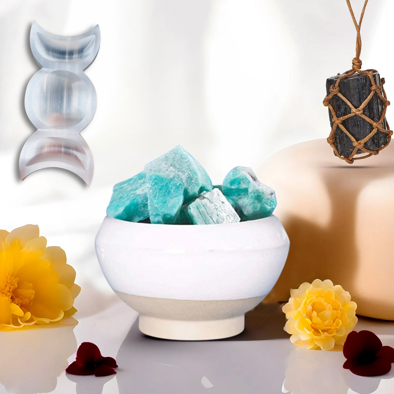 The bundle includes: Wrapped Black Tourmaline Crystal Protection Necklace, Raw Natural Amazonite Stones , Moon Divination Selenite Crystal Bowl