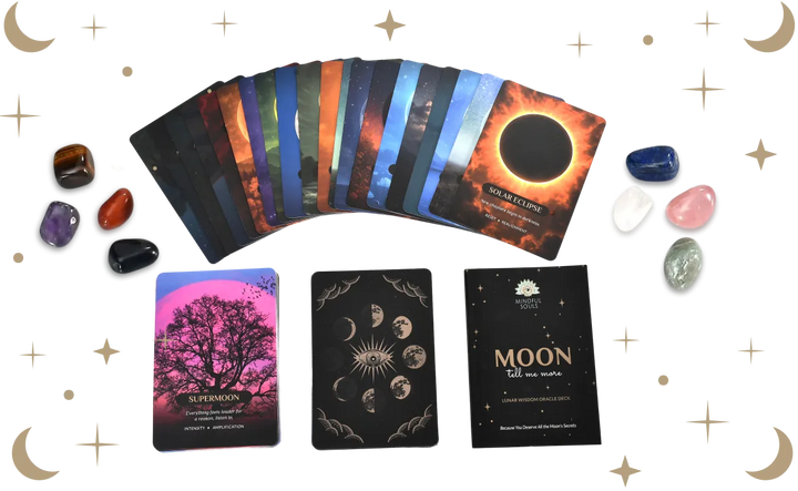 Crystal pairings, rituals, spreads, and detailed card meanings written by our team of astrologers and spiritual experts. Perfect even if you've never worked with oracle cards before. - 8 Surprise Crystals Inside A little gift from us—8 natural crystals to support every moon phase! Each one was handpicked to help you stay clear, grounded, and connected through it all.