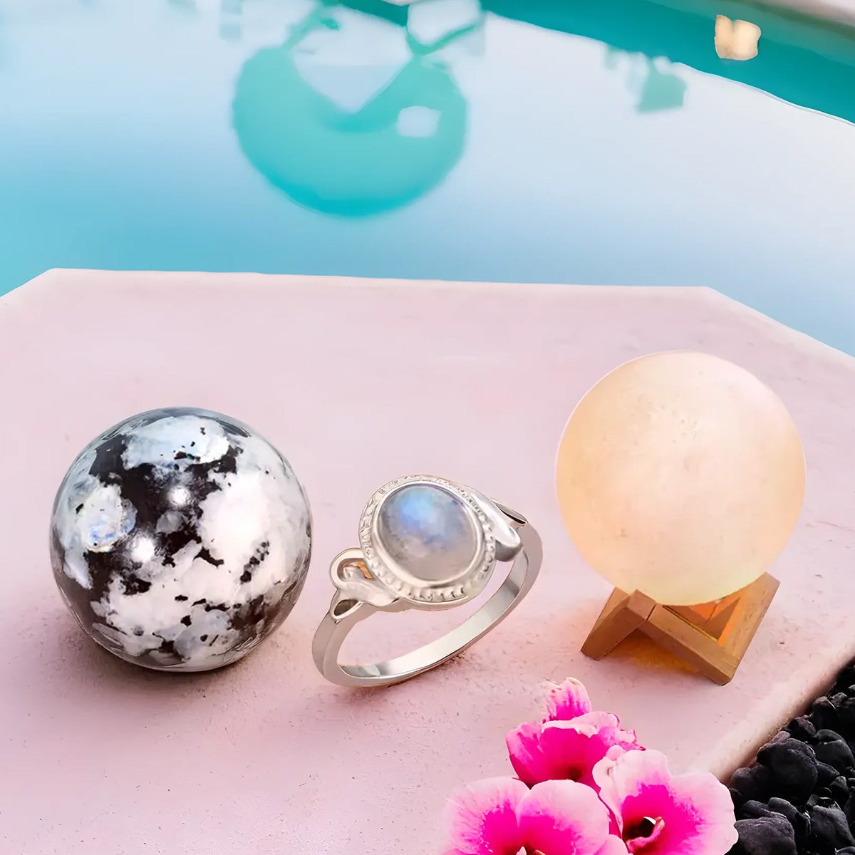 Bundle includes: Moonstone ring, moon night light lamp, moonstone sphere.