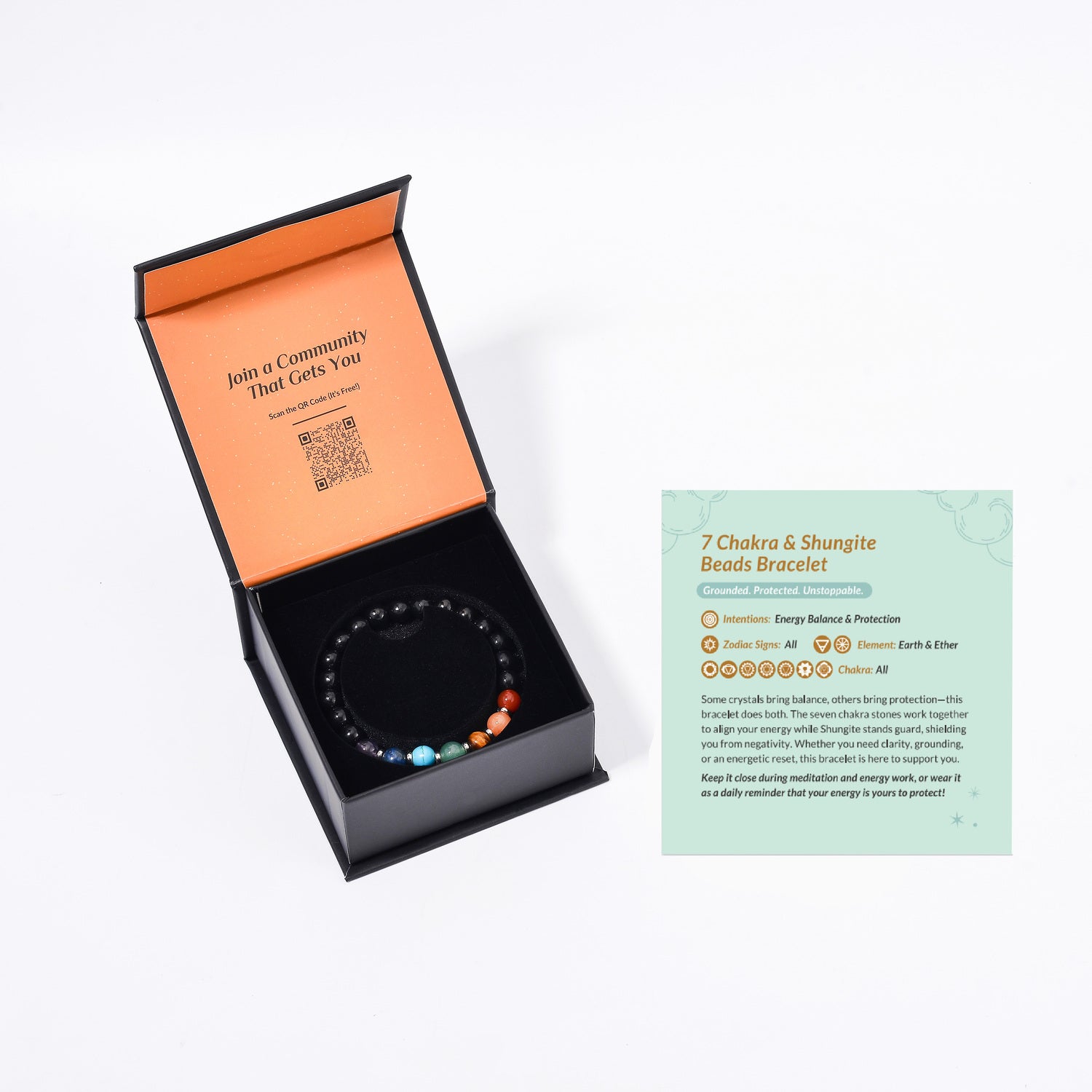 7 Chakra Bracelet with Shungite Beads: This wearable shield combines the balancing power of seven chakra stones with Shungite—a rare stone believed to neutralize negative energy and environmental stress.