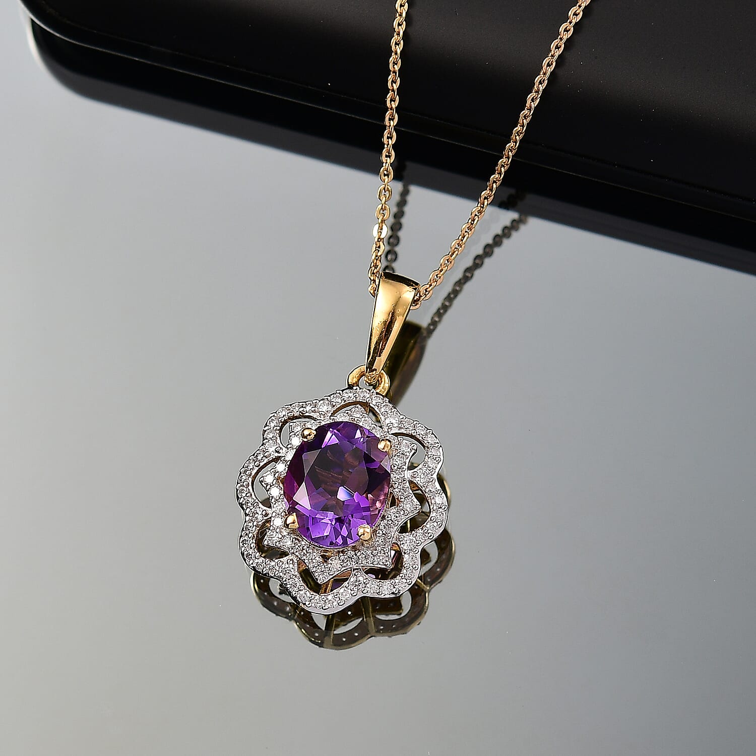 Delicate yet luminous, the Stellar Blossom Moroccan Amethyst Necklace captures the poetry of a flower in full bloom under a starlit sky. At its center rests a Moroccan amethyst glowing in rich violet tones, symbolizing love, protection, and spiritual depth. Encircled by brilliant moissanite accents arranged like radiant petals, and finished in 18K yellow gold vermeil over sterling silver, this necklace feels soft, romantic, and effortlessly elegant—designed to illuminate both everyday moments and special occasions.