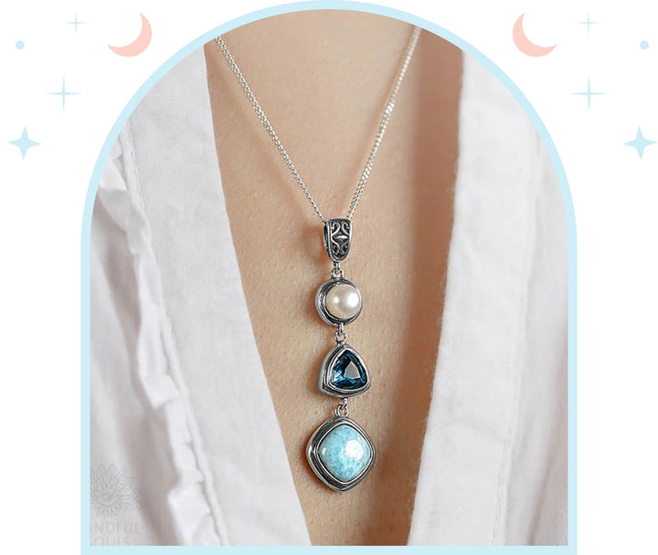 Made with 100% natural stones, this necklace is more than just jewelry—it’s a piece of the earth’s energy. Featuring a rare Larimar centerpiece, complemented by Blue Topaz and a Freshwater Pearl, each element is carefully chosen to to help you feel as good as you look. - Quality You Can Trust