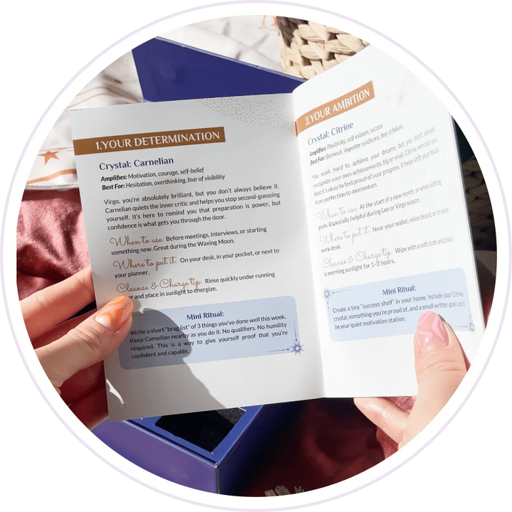 - Your Personalized Zodiac GuideYour guidebook breaks down your sign’s key traits and how to balance them with each crystal. From mini rituals, placement tips, affirmations, and cleansing instructions, you’ll always know exactly what to do and when to do it.